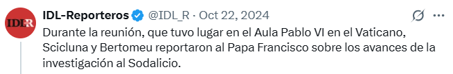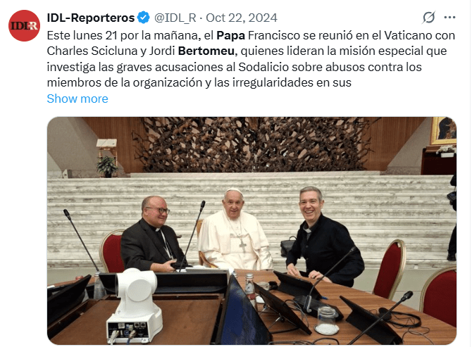 Como se puede ver en esta publicación con fecha del 22 de octubre, el Papa se reunió en el Vaticano con los dos miembros de la Misión Scicluna-Bertomeu.